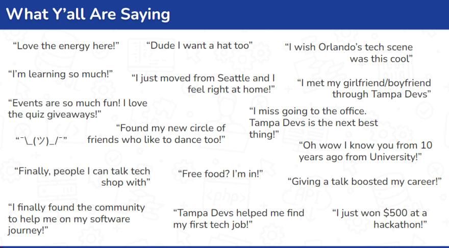 We hope to continue to grow and support our community through hosting events, building tools and resources, and helping individuals find success in the tech industry. Thank you for your support and for being a part of the Tampa Devs community.