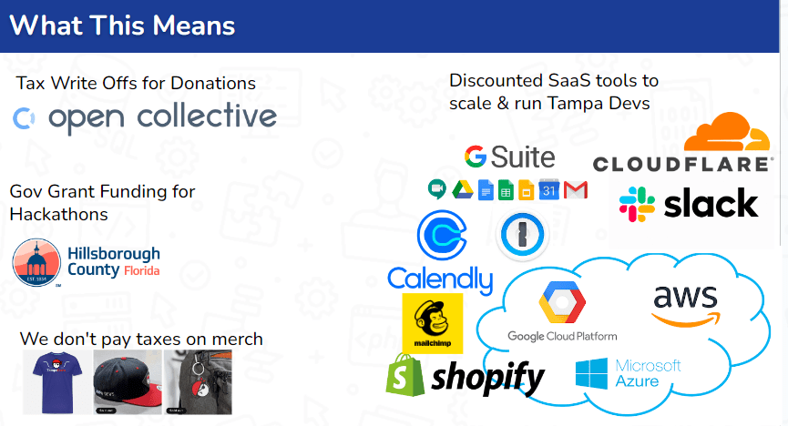 Since we got our 501c3 nonprofit status, there is so much work we're doing on the backend. Here's all the benefits we get as an org, that we use to create better community tools for our memberbase
