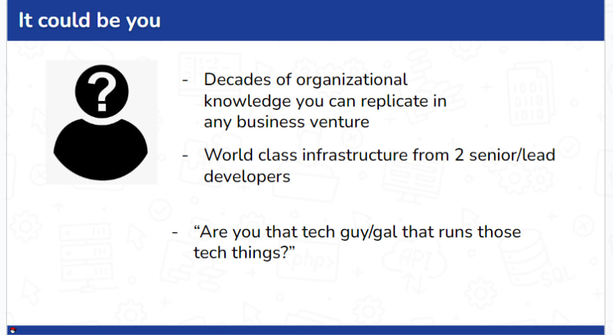 The reason we're doing al these infrastructural changes is because we have seen many past organizations fail after the main organizer leads. Charlton and I want to be able to retire effectively at some point in the future, and know everything is in working order.